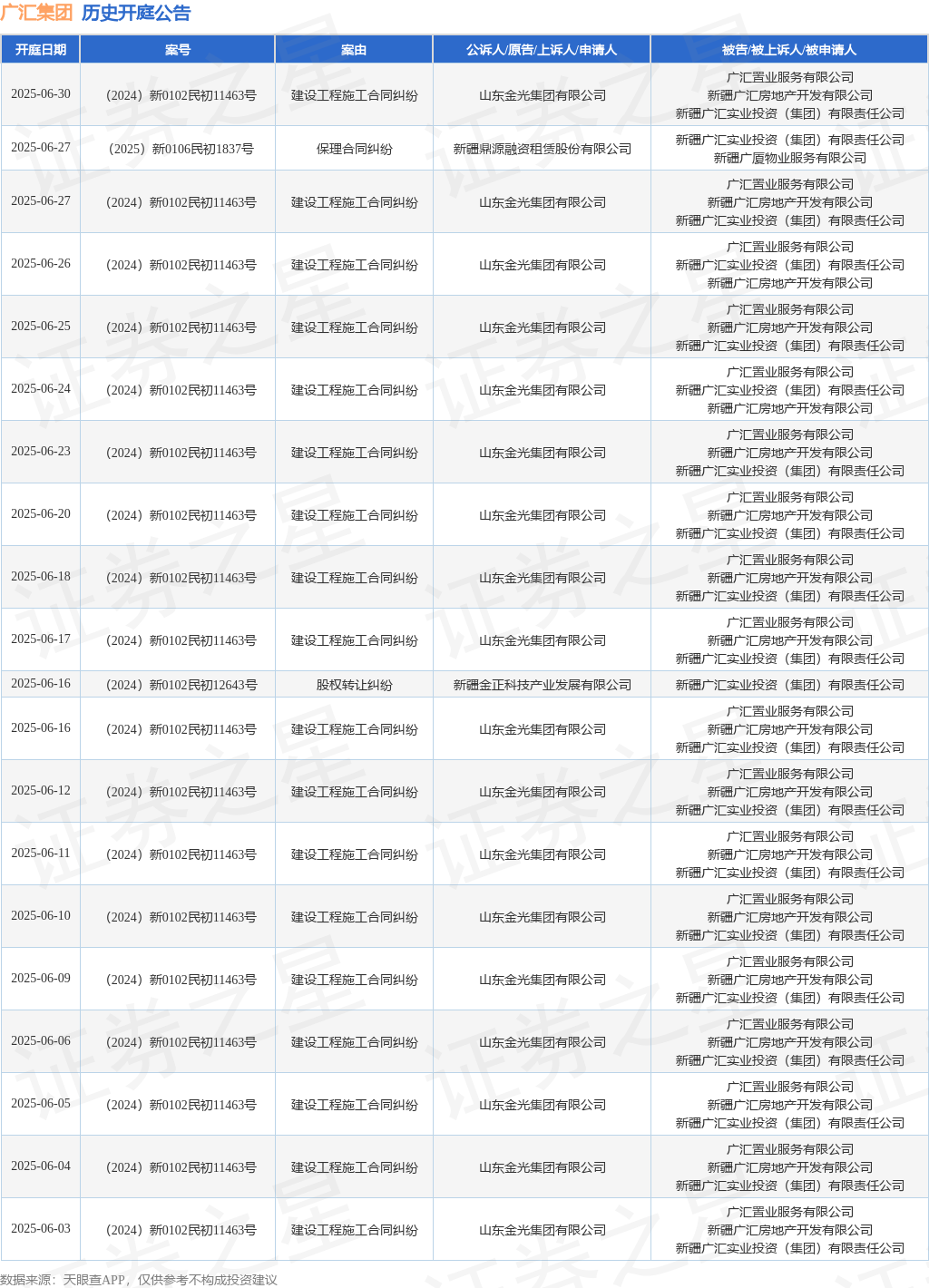案号:(2024)新0102民初11463号审理法院:乌鲁木齐市天山区人民法院案由:建设工程施工合同纠纷当事人信息: 原告/上诉人:山东金光集团有限公司 被告/被上诉人:广汇置业服务有限公司、新疆广汇房地产开发有限公司、新疆广汇实业投资(集团)有限责任公司开庭日期:2025年6月17日根据统计,近一年内以新疆广汇实业投资(集团)有限责任公司为当事人的历史开庭公告有110则,其中案由为“建设工程施工合同纠纷”的公告以94则居首,其次为“证券虚假陈述责任纠纷”有10则,“保理合同纠纷”有2则。历史开庭公告(前20条)如下: